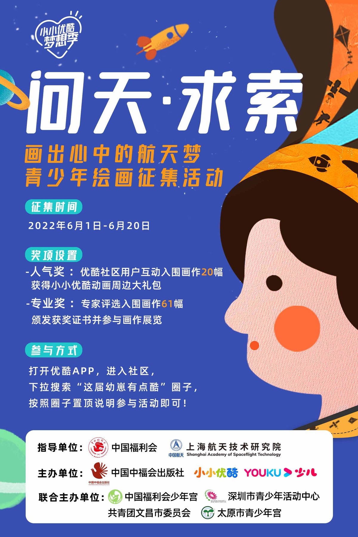 青少年是祖国的未来,也是航天梦想的未来,航天精神的传承者,为鼓舞当代青少年敢于有梦、勇于逐梦、勤于圆梦,中福会出版社和小小优酷在中福会和上海航天技术研究院的指导下,联合中福会少年宫、深圳青少年活动中心、文昌团市委、太原青少年宫等科技创新、与航天事业具有渊源城市的专业机构,从“营造关注、激发兴趣、培育创造”的角度出发,举办“问天·求索——画出心中的航天梦”青少年绘画征集活动。